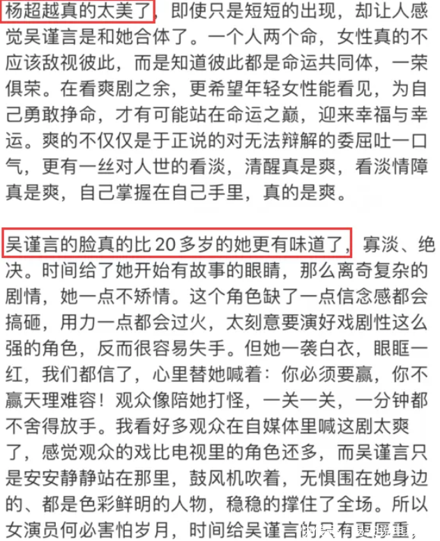 在这篇小作文中,伊能静领先抒发了我方对这部剧的深爱,她合计这部剧的剧情十分精彩,是一部让东说念主看了就停不下来的爽剧。同期,她也对剧中的演员们予以了高度评价,赞扬他们的演技十分出色,尤其是杨超过、吴谨言、王星越等年青演员,他们在剧中的发达让东说念主目下一亮。