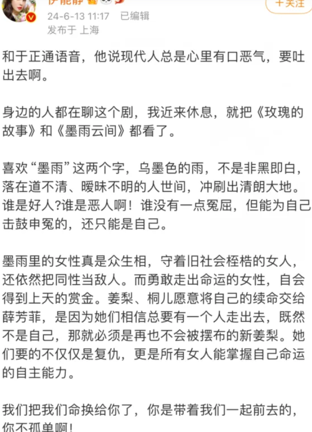 不得不说,伊能静的这篇小作文如实为《墨雨云间》这部剧作念了一次很好的宣传。她用我方的笔墨,让更多的东说念主了解了这部剧,也让更多的东说念主对这部剧产生了敬爱。同期,她也为剧中的演员们作念了一次很好的宣传,让更多的东说念主矫捷了这些优秀的演员。